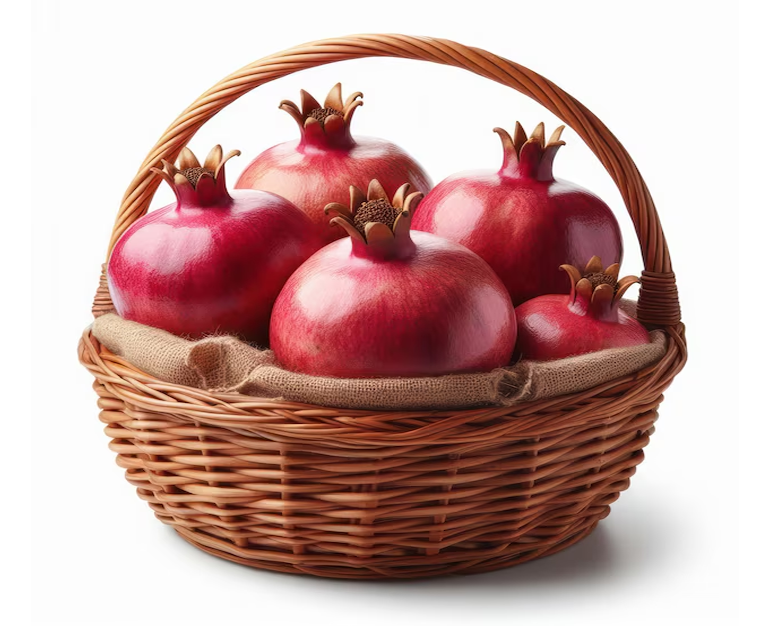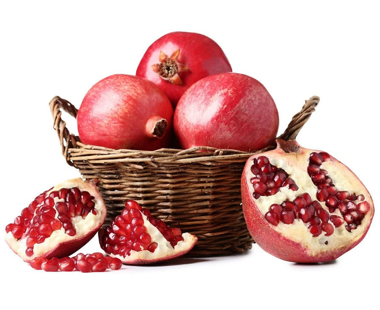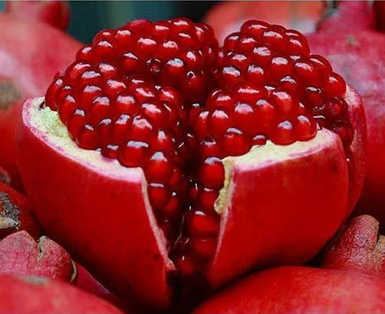 Pomegranate (Punica granatum) is a deciduous fruit-bearing shrub native to the Middle East and South Asia. The fruit has a tough, leathery rind, and inside it contains hundreds of edible seeds, known as arils, which are surrounded by juicy, ruby-red pulp. Pomegranates are packed with antioxidants, vitamin C, fiber, and minerals like potassium. They have been prized for their medicinal and nutritional properties for centuries, often associated with promoting heart health, reducing inflammation, and supporting overall wellness. The seeds are commonly used in salads, smoothies, juices, desserts, or as a garnish for various dishes.